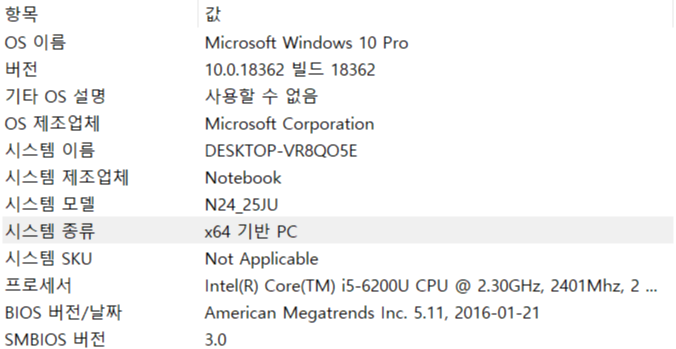 자신의 컴퓨터 또는 노트북의 운영체제가 어떤 bit인지를 모르시는 분들은 윈도우 검색창에 [시스템]을 입력하고 엔터를 누르시면 아래와 같이 시스템 정보를 보실 수 있습니다. 항목 중에서 시스템 종류 항목을 참고하시면 알 수 있습니다.