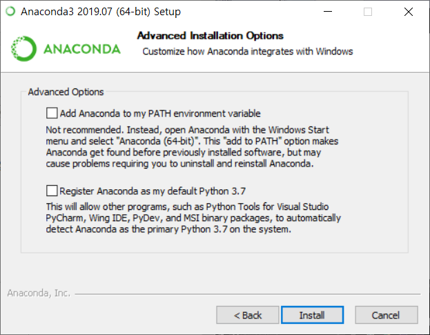 아래와 같이 아카콘다의 실행경로를 환경변수에 저장하겠다는 항목과 아나콘다 파이썬을 파이썬 3.7 버전으로 등록하겠다는 항목에 체크를 해주신 후 설치를 진행하시면 됩니다. 설치는 컴퓨터 또는 노트북 성능이 따라 약 5 ~ 10분 정도 소요됩니다.