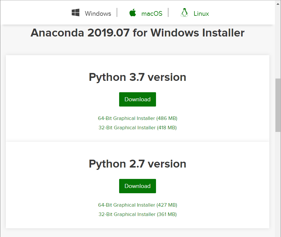 https://www.anaconda.com/distribution/ 링크를 클릭하여 아나콘다(Anaconda) 사이트로 이동합니다. 스크롤을 아래로 내리면 버전별로 다운로드 할 수 있는 버튼이 보입니다. 3.7버전과 2.7버전 중 가장 최신버전인 3.7버전을 다운로드하도록 하겠습니다. 자신의 컴퓨터 또는 노트북의 운영체제가 32bit, 64bit 중 해당되는 bit를 확인하신 후 다운로드하시면 됩니다.