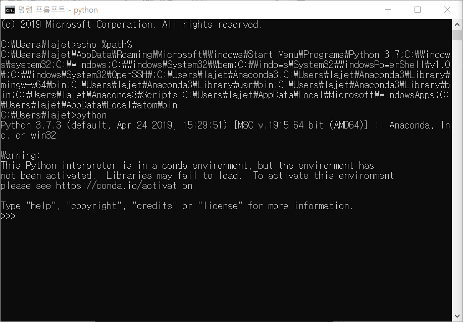 설치가 완료되었으면 아나콘다 파이썬의 실행경로가 환경변수로 등록 되었는지 확인해보도록 하겠습니다. 윈도우 검색창에 cmd를 입력하고 명령 프롬프트를 실행합니다. 명령 프롬프트 창에 echo %path%를 입력한 후 엔터를 누릅니다. 정상적으로 등록되었다면 아래와 같이 보이실 겁니다.