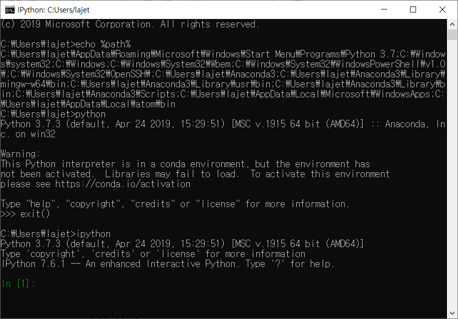이어서 명령 프롬프트에 exti()를 입력하여 python shell을 종료한 후, ipython을 입력하여 IPython이 설치가 잘 되었는지도 확인하겠습니다.