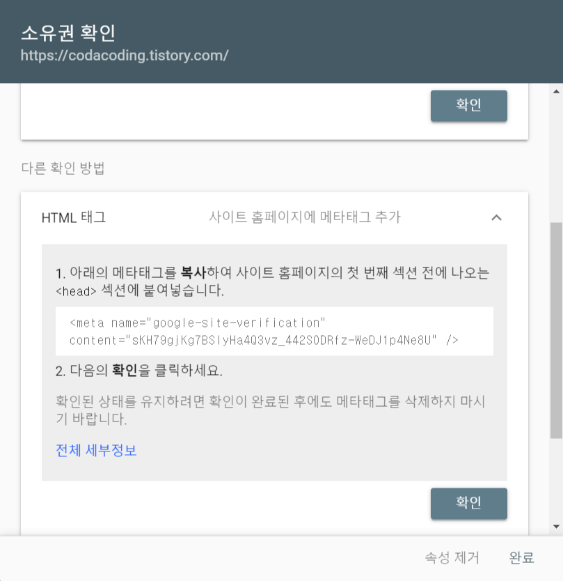 2단계 과정을 통해 인증 확인이 끝나고 소유권을 확인하는 절차에서 다른 확인 방법 중 스크롤을 아래로 내리면 보이는[HTML 태그]를 클릭하여 아래에 나오는 HTML 코드를 복사해줍니다.