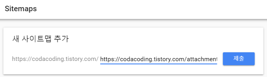 다시 구글 서치콘솔로 이동하여 [새 사이트맵 추가]에 6.2단계에서 복사한 사이트맵 파일의 링크주소를 붙여넣어줍니다. 단, 링크주소에 있는 티스토리 주소는 지워준 후 [제출]을 클릭합니다. 예를 들어, 아래 사진에서 보이는 주소 중 [https://codacoding.tistory.com/]은 이미 자동으로 입력되어있는 부분과 중복되므로 지워주도록 합니다.