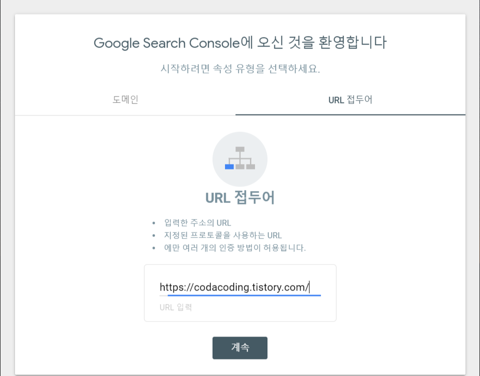 [URL 접두어]에 본인의 티스토리 블로그 URL을 입력한 후 계속 버튼을 클릭합니다.